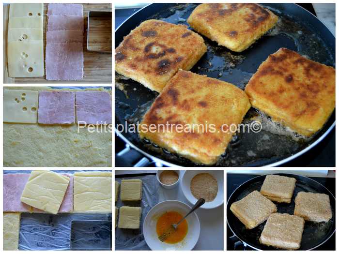 - Déposez une tranche de jambon et une de fromage sur la moitié des carrés de semoule puis couvrez- les des carrés de semoule restants.