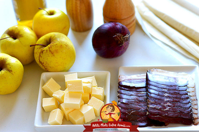 - Epluchez, épépinez et coupez les pommes en dés. Faites les cuire 10 min dans une poêle à feu moyen avec une belle noix de beurre en les remuant tout au long de la cuisson. Réservez-les dans un bol et remplacez les dés de pommes par l’oignon rouge finement émincé en y ajoutant un filet d’huile d’olive. Salez, poivrez. Laissez-le fondre 5 min puis ajoutez les pommes et réservez.