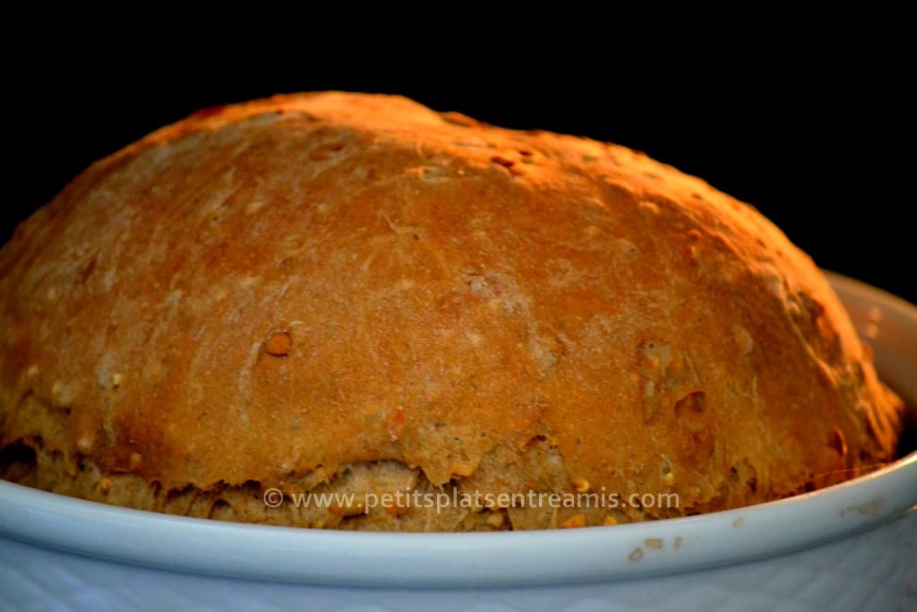- Au terme de le seconde levée, préchauffez votre four à 220°, placez un bol d’eau chaude à l’intérieur et au moment d’enfourner le pain, baissez la température du four à 190° et laissez cuire environ 35 à 40 mn.