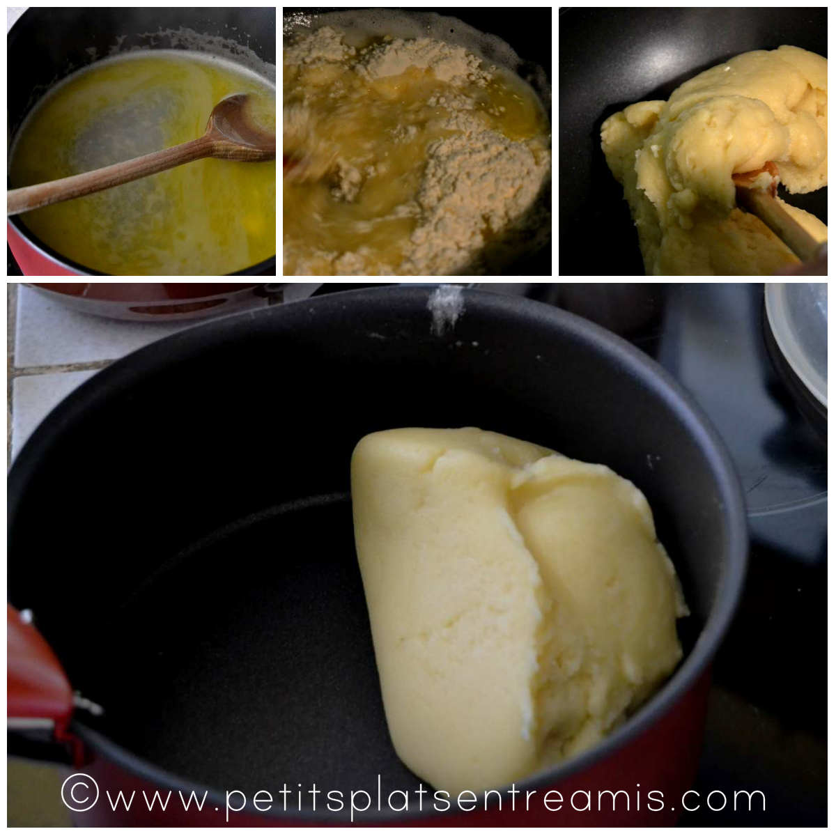 Lorsque le beurre est totalement fondu, hors du feu, versez la farine d’un coup et mélangez rapidement avec une cuillère en bois. Replacez la casserole sur feu doux en continuant de mélanger jusqu’à ce que la pâte se détache et forme une boule. Laissez 1 à 2 mn sur le feu afin qu’elle se dessèche tout en la roulant.