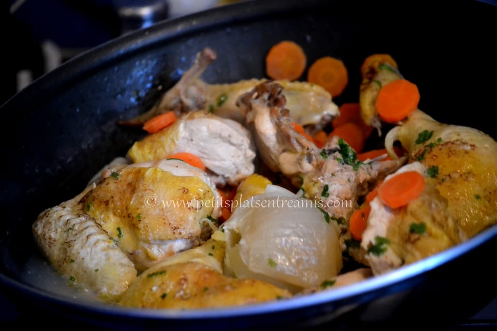 - Faites mijoter à feu doux 1 heure. Après 30 mn ajoutez les carottes, l’oignon, quelques brins de persil finement hachés et la carcasse. Salez et poivrez.
