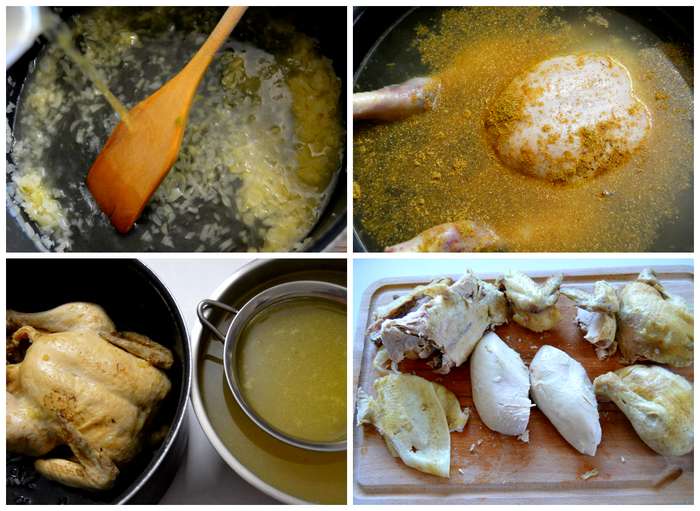 Mettez le poulet dans une grande cocotte, couvrez-le d’eau froide et faites-le bouillir pendant 2 mn. Egouttez-le et passez-le sous un filet d’eau froide. Réservez dans l’égouttoir. Lavez la cocotte.