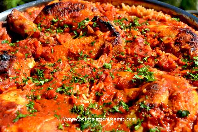 Recette de poulet aux tomates: aujourd’hui c’est un plat complet et familial que je vous propose avec ce poulet aux tomates. Fondant et parfumé à souhait ce plat de poulet fera le bonheur de vos convives. Cuit avec le riz et les tomates, c’est une harmonie de saveurs qui se dégage dès la première bouchée. Entre le poulet marengo et le poulet au riz, ce plat est riche en textures et en goût. Découvrez la recette étape par étape ci-dessous.