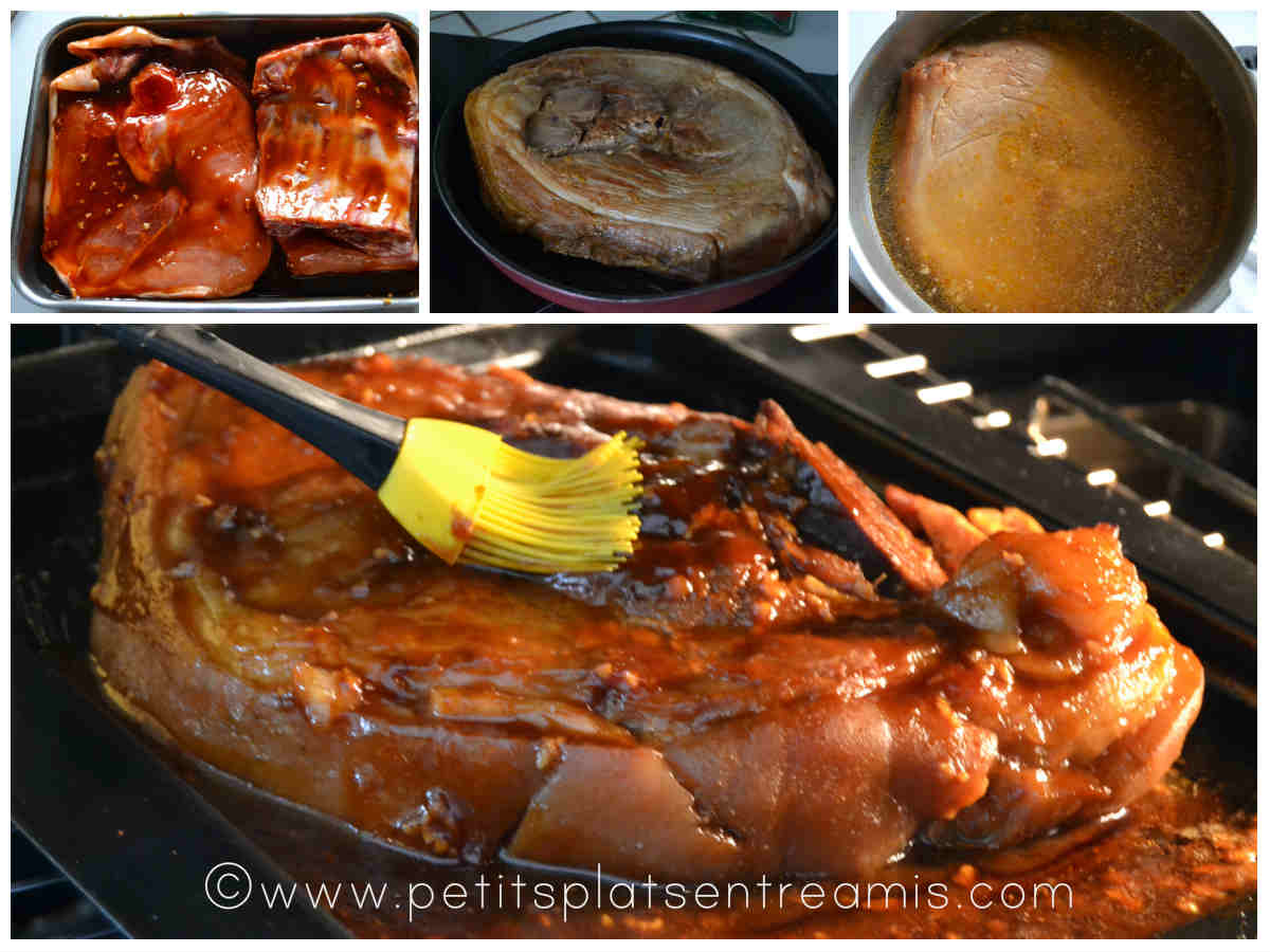 Mélangez tous les ingrédients de la marinade dans une casserole à feu moyen et faites cuire 3 à 4 mn le temps d’épaissir et de laisser fondre le sucre. Ajoutez les 2 gousses d’ail hachées à feu éteint.- Enduisez la rouelle de porc de la totalité de la marinade refroidie et laissez mariner au minimum 2 heures en la retournant 1 ou 2 fois.