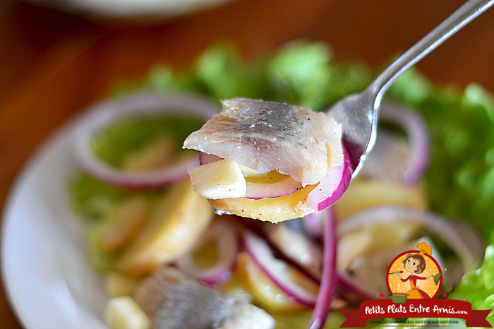 Recette de salade de pommes de terre aux harengs: c’est une délicieuse recette de bistrot que je vous invite à découvrir aujourd’hui. Quel plaisir de déguster cette salade composée de filets de harengs fumés, pommes de terre et oignons rouges et le tout assaisonné d’une vinaigrette au vinaigre de cidre. Ce plat simple et savoureux est servi tiède et peut se déguster soit en entrée soit en plat principal. Une recette à découvrir ou redécouvrir sans modération !