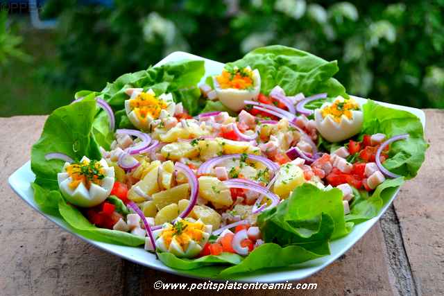 Faites cuire les pommes de terre à l’eau bouillante ou à la vapeur sans les éplucher. Laissez-les refroidir légèrement puis pelez-les délicatement encore tièdes. Coupez-les en rondelles pas trop fines.- Faites cuire les oeufs durs, laissez-les refroidir dans l’eau froide, écalez-les puis coupez-les en deux selon votre imagination.