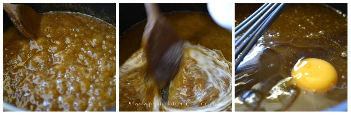 - Dans une casserole à fond épais faites chauffer à feu moyen le sirop de canne, les sucres en poudre et vanillé, la mélasse, le sel, le beurre. Remuez continuellement et lorsque le sucre est fondu portez à ébullition 2 mn.