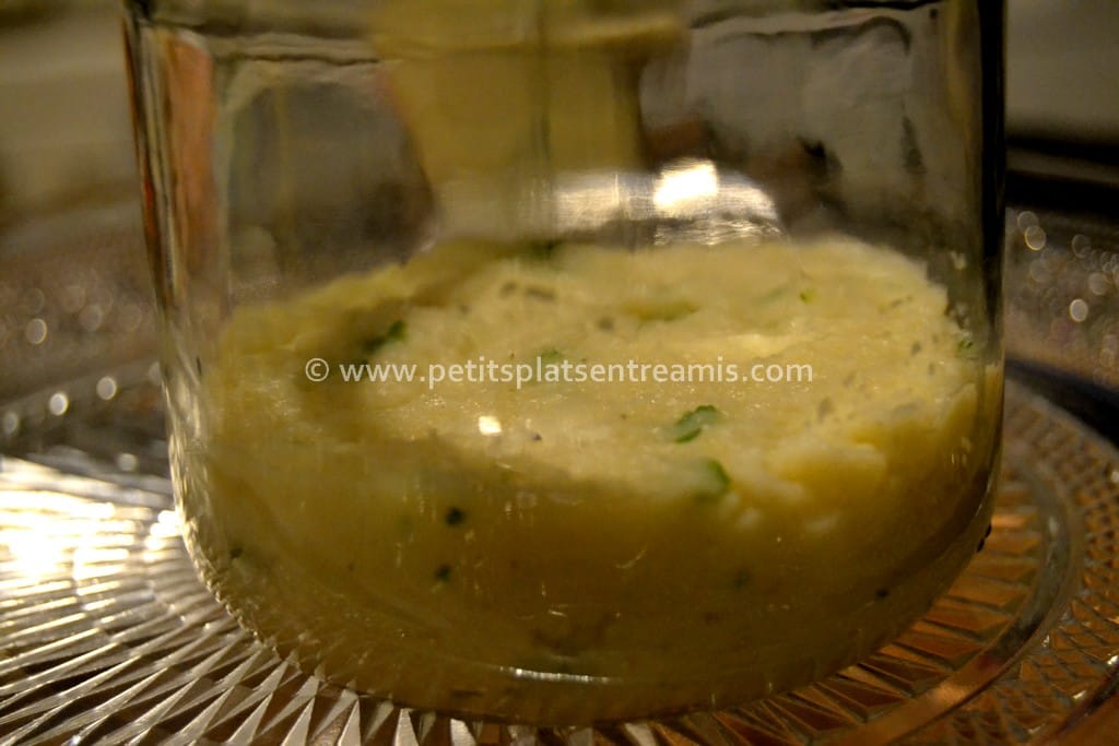 - Remplissez vos bocaux en superposant la purée de chou-fleur blanc,
